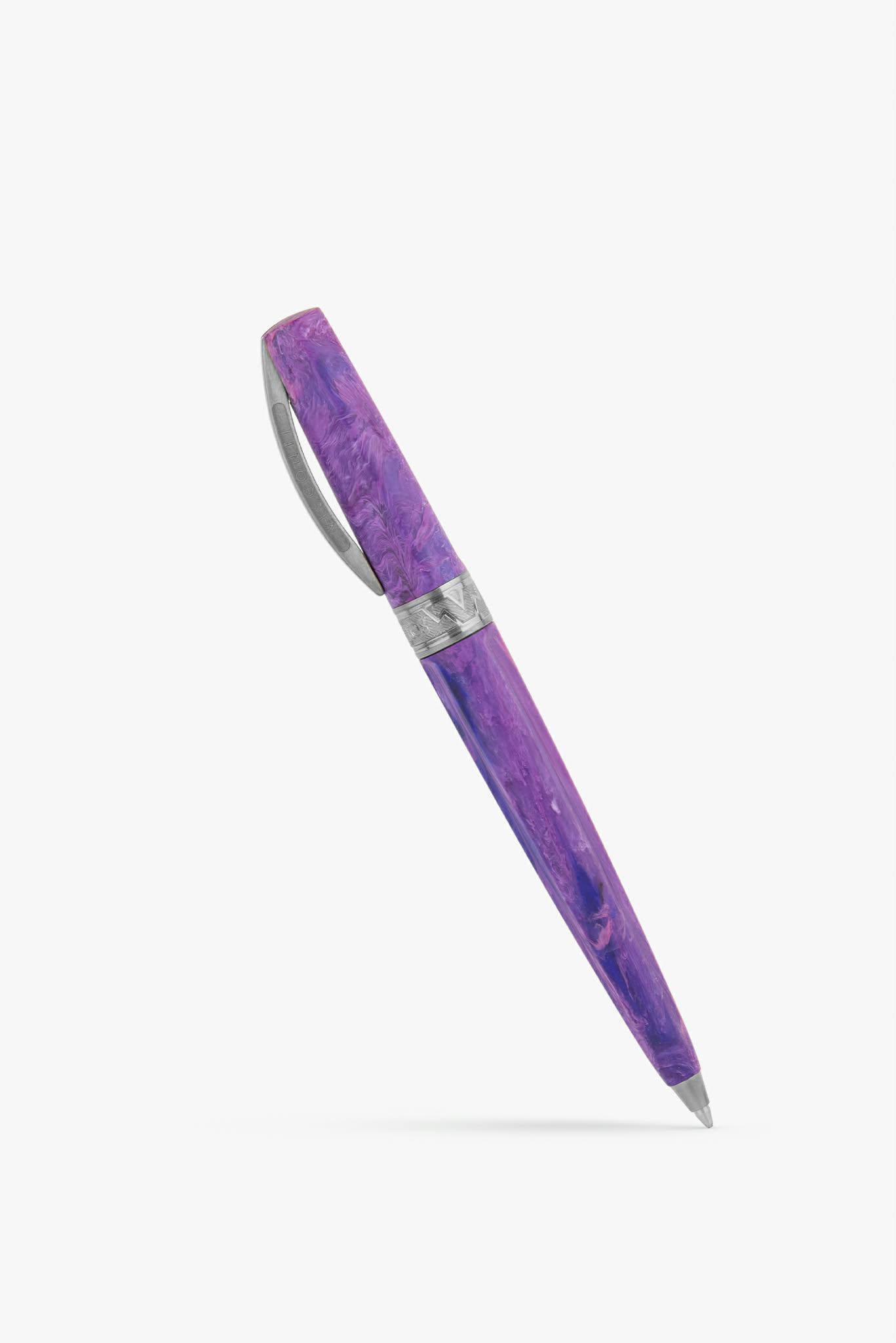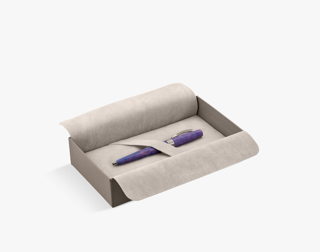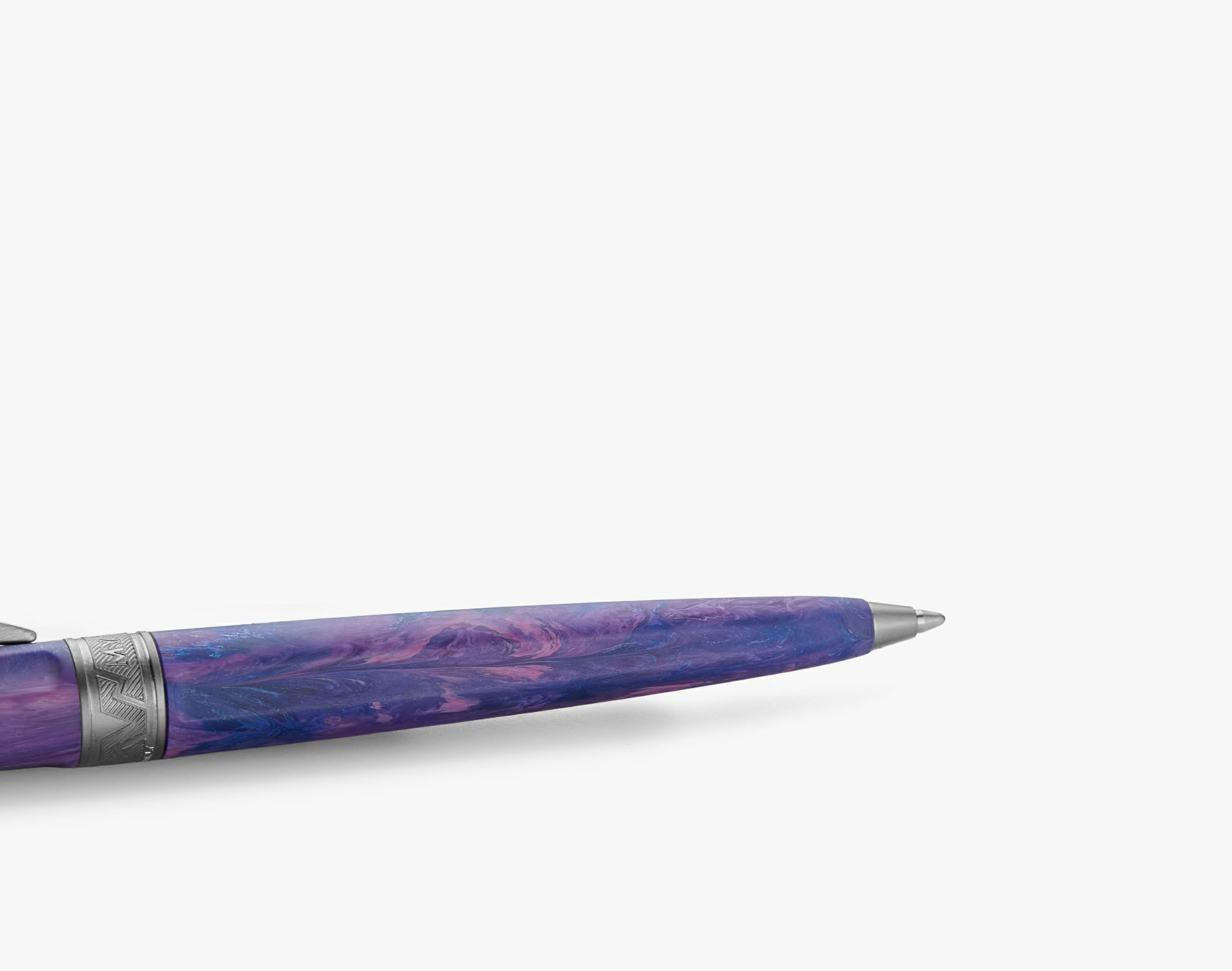 Chất liệu resin tím than mờ (matte violet acrylic resin): Thân bút Persephone được chế tác từ nhựa acrylic cao cấp với sắc tím than sâu thẳm, điểm xuyết những ánh xanh nửa đêm (midnight blue undertones) huyền ảo . Màu sắc này không chỉ đơn thuần là thẩm mỹ – nó là biểu tượng cho màn đêm vĩnh cửu của địa phủ, cho sự tĩnh lặng và uy nghiêm của nữ hoàng cõi âm .