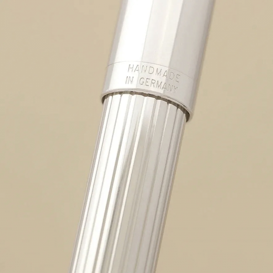 Trái tim của cây bút dạ bi là thân được chế tác từ bạc sterling 925 nguyên khối (solid 925 sterling silver) – một trong những chất liệu quý được ưa chuộng nhất trong chế tác đồ cao cấp . Toàn bộ thân bút và các bộ phận kim loại đều được làm từ bạc nguyên khối, không chỉ là lớp mạ bề mặt . Bề mặt bạc ấm áp với sắc trắng đặc trưng, có độ sáng mịt và tinh tế. Theo thời gian, bạc sẽ phát triển một lớp patina nhẹ, tạo nên vẻ đẹp cổ điển và dấu ấn riêng cho từng cây bút.