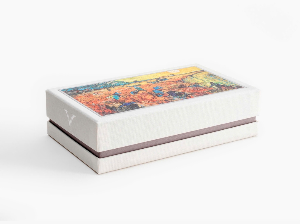 Tiếp nối hành trình tôn vinh những danh họa vĩ đại, thương hiệu Visconti danh tiếng nước Ý ra mắt bộ sưu tập Van Gogh Red Vineyard – một tuyệt tác nghệ thuật lấy cảm hứng từ bức tranh "Vườn nho đỏ ở Arles" (The Red Vineyard at Arles) do Vincent Van Gogh sáng tác vào năm 1888 tại Arles, Pháp . Đây là bức tranh nổi tiếng và đặc biệt bởi nó được cho là tác phẩm duy nhất của Van Gogh được bán ra trong suốt cuộc đời ông . Bức tranh tái hiện khung cảnh những người nông dân thu hoạch nho dưới ánh hoàng hôn rực rỡ, với những vườn nho trải dài ngập tràn sắc đỏ cam ấm áp – một kiệt tác về màu sắc và cảm xúc .