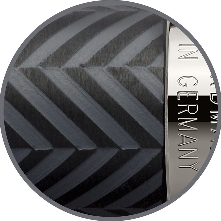 Điểm nhấn đầu tiên của Guilloche Ciselé Anthracite chính là thân bút được chế tác từ nhựa quý mờ (matt precious resin) màu anthracite với bề mặt được chạm khắc guilloche hình xương cá tinh xảo (herringbone guilloché pattern) . Những đường vân được khắc từng đường một, tạo nên hoa văn tinh tế và độc đáo. Sau khi chạm khắc, thân bút tiếp tục được hoàn thiện thủ công qua nhiều lớp sơn và đánh bóng (manually lacquered and polished) , tạo nên bề mặt mịn màng, sang trọng và có chiều sâu thị giác đặc biệt .