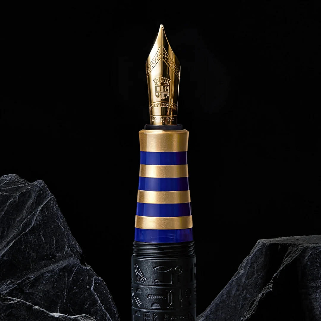 Phần tay cầm (grip section) là điểm nhấn rực rỡ nhất của cây bút. Các vòng kim loại mạ vàng 24k (24-carat-gold-plated metal rings) xen kẽ với các vòng sơn mài xanh lam bóng (high-gloss blue painted rings) được sơn thủ công nhiều lớp, tái hiện chính xác những đường sọc vàng-xanh trên khăn nemes – biểu tượng hoàng gia trên mặt nạ vàng Tutankhamun . Đây là một trong những chi tiết tinh xảo nhất, đòi hỏi hàng giờ lao động thủ công tỉ mỉ.