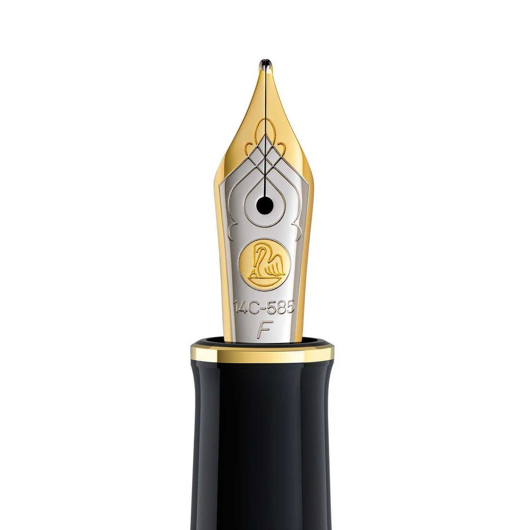 Ngòi vàng 14K hai tông màu mạ Rhodium: Trái tim của cây bút là ngòi vàng 14K (14-carat/585 gold) hai tông màu với lớp trang trí rhodium (rhodium trim) tinh tế . Ngòi được các nghệ nhân Pelikan kiểm tra chất lượng viết bằng tay (writing qualities were tested by hand) trước khi xuất xưởng . Có sẵn các tùy chọn kích cỡ EF (siêu nhỏ), F (nhỏ), M (trung bình), B (lớn) . Đặc biệt, ngòi M (Medium) cho nét chữ trung bình, phù hợp với những nét chữ có độ bay bổng lớn hơn (suitable for handwritings with bigger swings) .