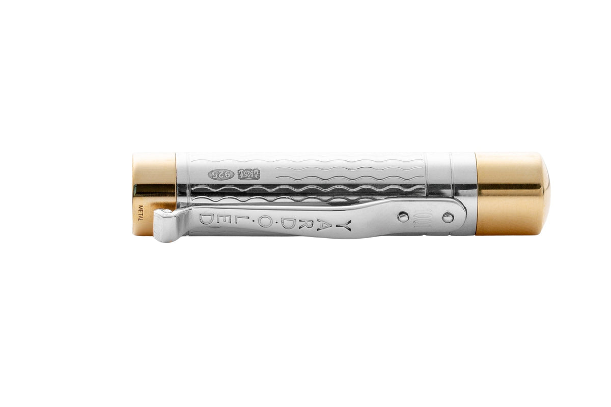 Điểm nhấn tinh tế khác là viền đồng vàng (golden brass trim) bao quanh thân bút, làm nổi bật vẻ đẹp sang trọng của bạc và tạo điểm nhấn thị giác tinh tế .