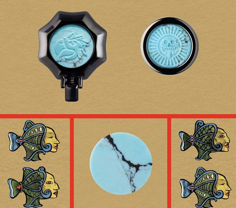 Người Aztec tôn thờ đá turquoise (màu xanh lam-xanh lục) như một trong những báu vật quý giá nhất của họ (one of their most valuable treasures) . Loại đá quý này được sử dụng để trang trí mặt nạ, dao tế lễ và khiên (masks, knives and shields) , tượng trưng cho lửa và sức mạnh thần linh . Trên Pen of the Year 2022, hai đĩa turquoise (turquoise discs) được khảm ở phần cuối thân và đỉnh nắp bút, với những hình khắc tinh xảo: