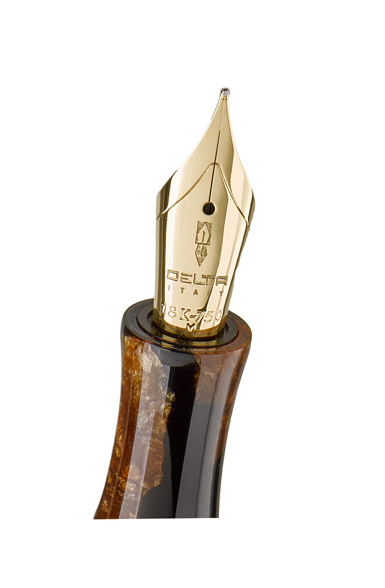 Ngòi bút bằng vàng khối 18 Karat - 750, khắc logo Delta, có các loại: Extra Fine, Fine, Medium, Broad, và ngòi Italic 1,1 mm; Ngòi Flex bằng vàng khối 14 karat - 585 cũng có sẵn.