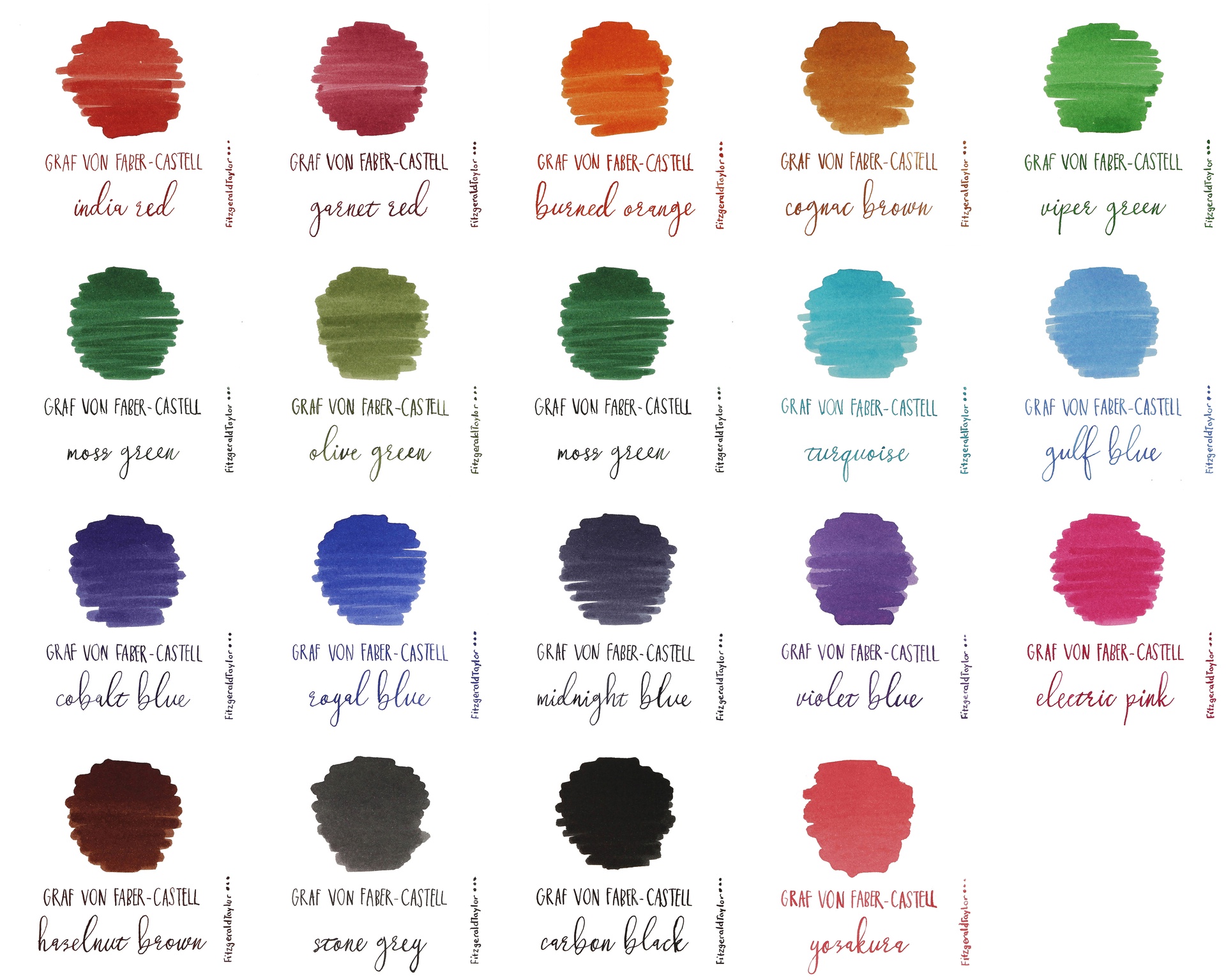 Dưới đây là danh sách 20 màu mực trong bộ sưu tập Graf von Faber-Castell, được lấy cảm hứng từ vẻ đẹp của thiên nhiên :