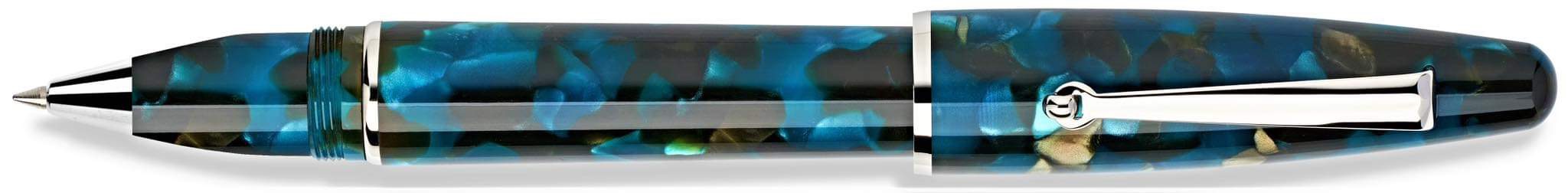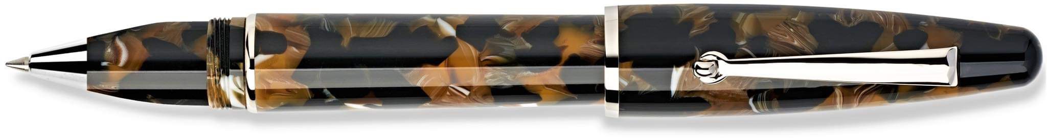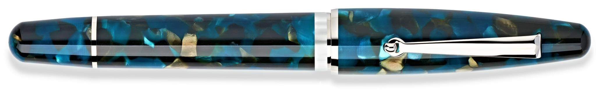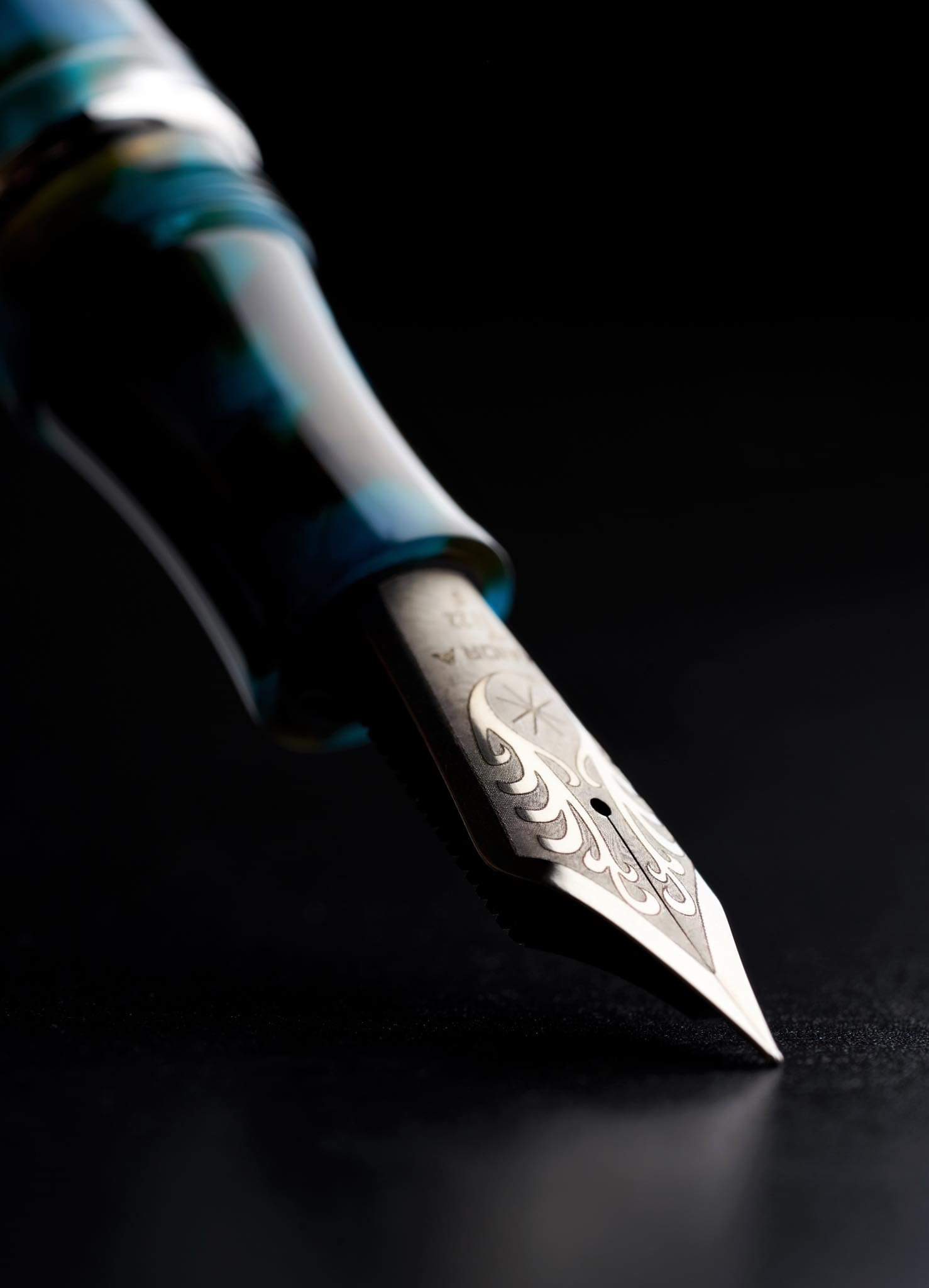 Nhựa Resin đặc biệt được chế tác thủ công làm thân và nắp bút. Cap band hoạ tiết độc đáo, chế tác từ bạc khối Sterling Silver 925, các bộ phận kim loại được phủ kim loại quý Palladium; cơ chế nạp mực Pisyon filler; cửa sổ trong suốt để kiểm tra mức mực; ngòi Titan size #8 (lớn) “THE FIRST”; feed cấp mực ebonite đen, cỡ #8 (lớn).”