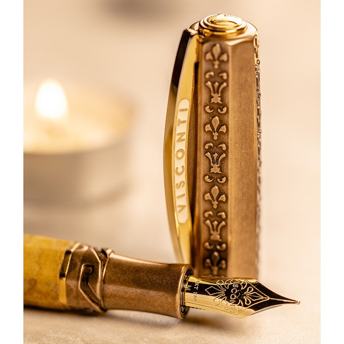 Hoa huệ tây (hay còn gọi là hoa ly, hoa loa kèn), biểu tượng của thành phố Florence, được khắc trên nắp bút, nơi các hàng trang trí của hoa tô điểm một cách nghệ thuật trên bề mặt đồng cổ. Cài bút mang đặc trưng riêng của Visconti được tô điểm bằng vàng Gold và men ngà. Lấy cảm hứng từ Ponte Vecchio (“Cầu cũ”), cây cầu vòm nổi tiếng ở Florence bắc qua sông Arno ở điểm hẹp nhất, dáng cài này đã trở thành biểu tượng của Visconti như một cầu nối văn hóa, sử dụng bút viết làm phương tiện truyền tải thông điệp. Ngoài giá trị lịch sử, Ponte Vecchio còn đóng vai trò trung tâm trong hệ thống đường phố: nó kết nối Florence của La Mã với Via Cassia Nuova và được Hadrian đưa vào sử dụng vào năm 123 sau Công nguyên. Hadrian là hoàng đế của Rome từ năm 117 đến 138.